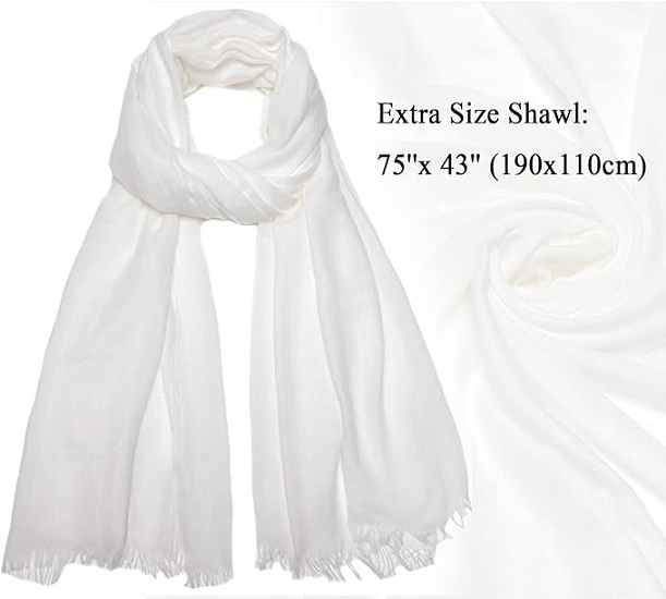 EXTRA LARGE SHAWL: 75 X 43 inches(190X110cm), it is extra long and large scarves in current markets. The perfect length able to be used as a shawl, wrap, cover up, hijab, knotted ,twisted, wrapped or doubled around neck, head and shoulders in many different ways.